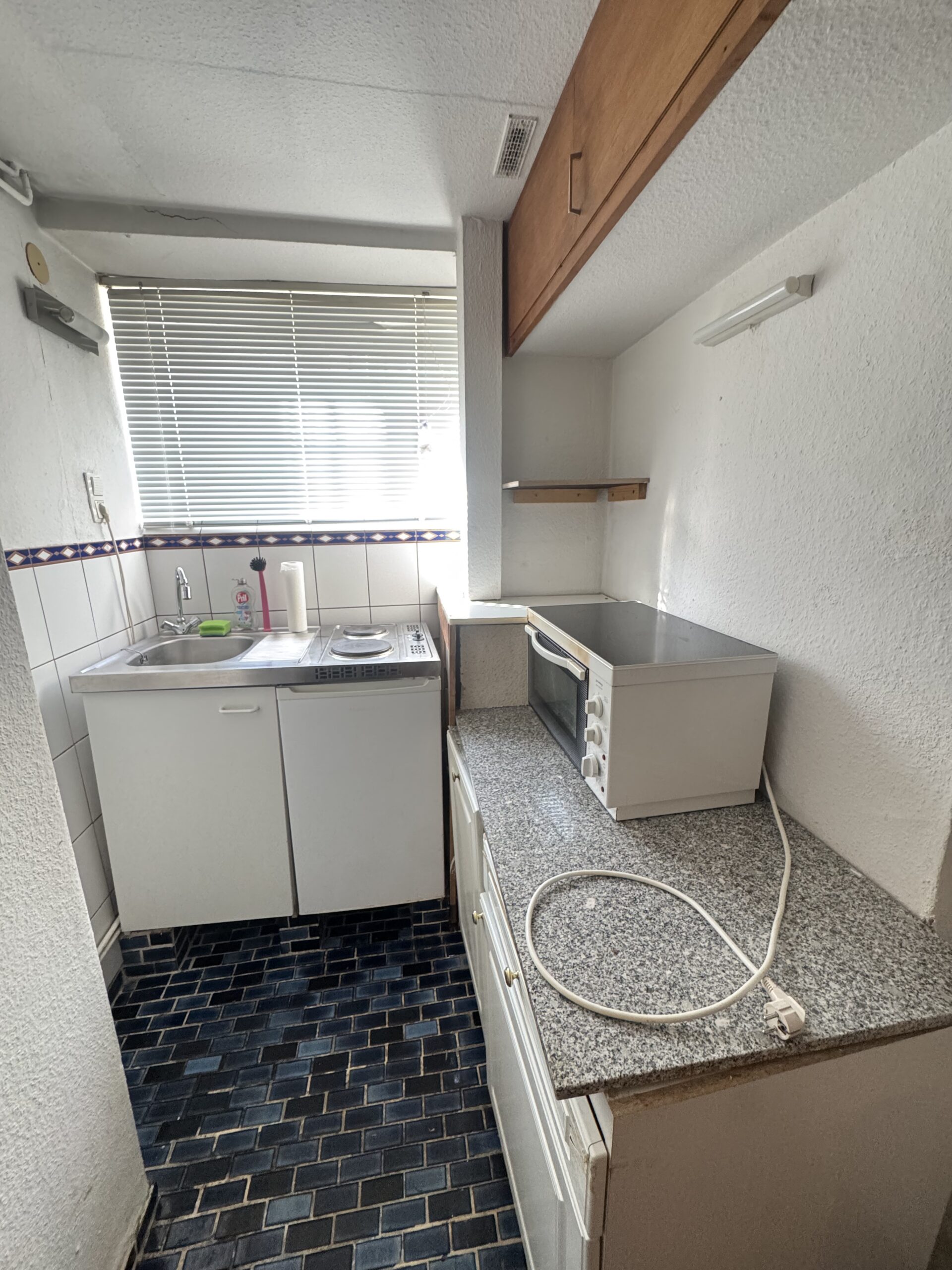 Die Küche bietet viel Platz für eigene Gestaltungsideen und ist bereits mit einem Spülenschrank sowie praktischen Küchenschränken ausgestattet.