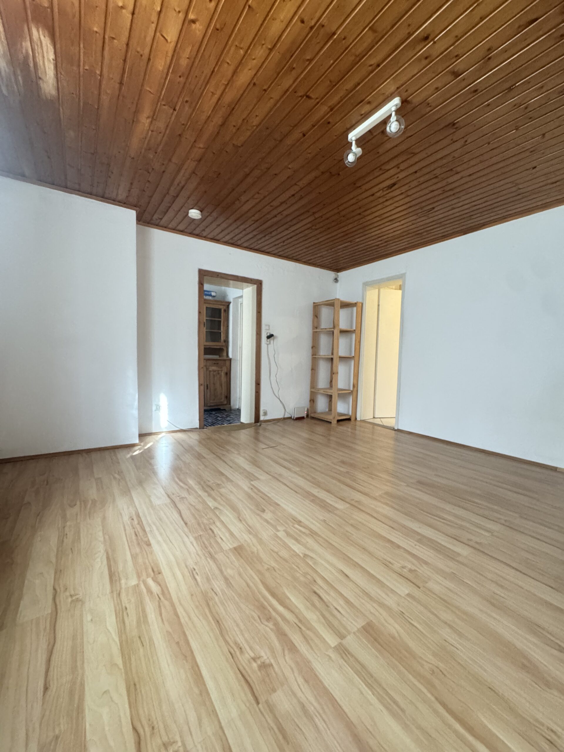 Bei Wunsch kann die Küche nach Absprache auf eigene Kosten neu gestaltet werden. Im Wohnzimmer sorgt der Laminatboden in Kombination mit der Holzvertäfelung an der Decke für eine angenehme und warme Atmosphäre.